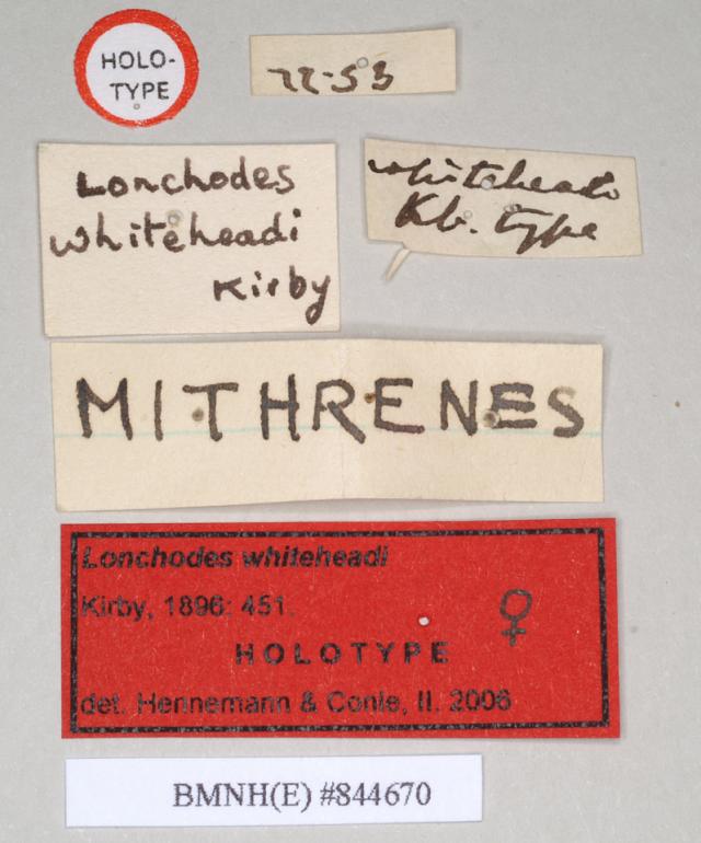 female, data labels of Lonchodes whiteheadi [small rectangular label reversed] (holotype)
