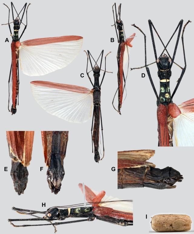 C, habitus, ventral view. D, head and thorax, dorsal view. E, apex of abdomen, dorsal view. F, ventral view. G, lateral view. H, head and thorax, lateral view. I, egg, dorsal view.