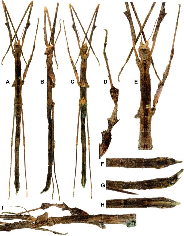 female (paratype). A. Habitus, dorsal view. B. Habitus, lateral view. C. Habitus, ventral view. D. Right median leg, detail. E. Anterior part of body, dorsal view. F. Apex of abdomen, dorsal view. G. lateral view. H. ventral view. I. Anterior part of body, lateral view