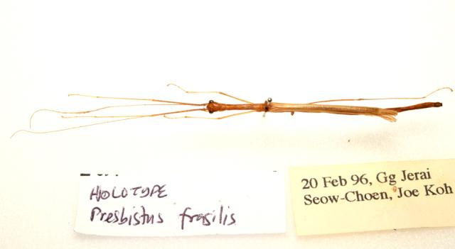 male Presbistus fragilis Seow-Choen, 2000, dorsal view (holotype) [renamed as Necroscia ischnotegmina Bragg, 2005]